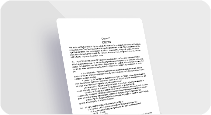 15 - 1 Chapter 15 AVIATION Army aviation and Infantry units can be fully integrated with other members of the combined arms team to form powerful and flexible air assault task forces. These forces can project combat power throughout the depth and width of the modern battlefield, with little regard for terrain barriers. These combat operations are deliberate, precisely planned, and vigorously executed. They strike the enemy when and where he is most vulnerable. See Figure 2-11, Air Movement Annex, and Figure 2-12, Coordination Checklists, which include the Army Aviation Coordination Checklist. 15-1. REVERSE PLANNING SEQUENCE. Successful air assault execution is based on a careful analysis of METT-TC and detailed, precise reverse planning. Five basic plans that comprise the reverse planning sequence are developed for each air assault operation. The battalion is the lowest level that has sufficient personnel to plan, coordinate, and control air assault operations. When company size or lower operations are conducted, most of the planning occurs at battalion or higher headquarters. The five plans are– a. Ground Tactical Plan. The commander’s ground tactical plan forms the foundation of a successful air assault operation. All additional plans must support this plan. It specifies actions in the objective area to ultimately accomplish the mission and address subsequent operations. b. Landing Plan. The landing plan must support the ground tactical plan. This plan outlines a sequence of events that allows elements to move into the area of operations, and ensures that units arrive at designated locations at prescribed times, and that as soon as they arrive, they are prepared to execute the ground tactical plan. c. Air Movement Plan. The air movement plan is based on the ground tactical and landing plans. It specifies the schedule and provides instructions for air movement of troops, equipment, and supplies from PZs to LZs. d. Loading Plan. The loading plan is based on the air movement plan. It ensures that troops, equipment, and supplies are loaded on the correct aircraft. Unit integrity is maintained when aircraft loads are planned. Cross loading may be necessary to ensure survivability of command and control assets, and that the mix of weapons arriving at the LZ is ready to fight. e. Staging Plan. The staging plan is based on the loading plan and prescribes the arrival time of ground units (troops, equipment and supplies) at the PZ in the order of movement 15-2. SELECTION AND MARKING OF PICKUP AND LANDING ZONES a. Considerations. Small unit leaders should consider the following when selecting a PZ/ LZ: (1) Size. Minimal circular landing point separation from other aircraft and obstacles is needed: OH 58D – 25 meters. UH 1, AH 1 – 35 meters. UH 60, AH 64 – 50 meters. Cargo helicopters – 80 meters. (2) Surface Conditions. Avoid potential hazards such as sand, blowing dust, snow, tree stumps, or large rocks. (3) Ground Slope. 0 to 6 percent—land upslope. 7 to 15 percent—land sideslope. Over 15 percent—no touchdown (aircraft may hover). (4) Obstacles. An obstacle clearance ratio of 10 to 1 is used in planning approach and departure of the PZ and LZ. For example, a tree that is 10 feet tall requires 100 feet of horizontal distance for approach or departure. Mark obstacles with a red chemlight at night or red panels in daytime. Avoid using markings if the enemy would see them. (5) Approach/ Departure. Approach and depart into the wind and along the long axis of the PZ/ LZ. (6) Loads. The greater the load, the larger the PZ/ LZ must be to accommodate the insertion or extraction. b. Marking of PZs and LZs. (1) Day. A ground guide will mark the PZ or LZ for the lead aircraft by holding an M16/ M4 rifle over his head, by displaying a folded VS 17 panel chest high, or by other coordinated and identifiable means.