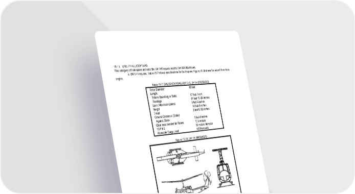 15 - 17 15-11. UTILITY HELICOPTERS This category of helicopters includes the UH 1H Iroquois and the UH 60A Blackhawk. a. UH 1H Iroquois. Table 15-7 shows specifications for the Iroquois; Figure 15-18 shows the aircraft from three angles. Table 15-7. SPECIFICATIONS FOR THE UH 1H (IROQUOIS) Rotor Diameter 48 feet Length: Rotors Operating or Static Fuselage 57 feet 1 inch 41 feet 10-3/4 inches Span, Maximum Lateral 9 feet 4 inches Height 14 feet 6 inches Tread 8 feet 6-1/2 inches Ground Clearance (Static) Against Stops 6 feet 6 inches Clear area needed for Rotors 17.4 meters TDP # 2 35 meters diameter Allowable Cargo Load 4,000 pounds Figure 15-18. UH 1H (IROQUOIS)