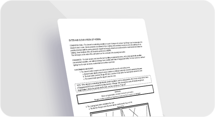 ENTER AND CLEAR A ROOM (07-4-D9509) CONDITIONS (CUE)—The element is conducting operations as part of a larger unit and your four-Ranger team has been given the mission to clear a room. Enemy personnel are believed to be in building. Noncombatants may be present in the building and are possibly intermixed with the enemy personnel. Support and security elements are positioned at the initial foothold and outside the building. Some iterations of this drill should be performed in MOPP4. This drill begins on the order of the unit leader or on the command of the clearing team leader. STANDARDS—The team secures and clears the room by killing or capturing the enemy, while minimizing friendly casualties, noncombatant casualties, and collateral damage; team complies with Rules of Engagement (ROE). The team maintains a sufficient fighting force to repel an enemy counterattack and continue operations. PERFORMANCE MEASURES 1. The element leader occupies a position to best control the security and clearing teams. a. Element leader directs a team to secure corridors or hallways outside the room with appropriate firepower. b. The team leader (normally Ranger #2) takes a position to best control the clearing team outside the room. c. The element leader gives the signal to clear the room. NOTE: If the element is conducting high-intensity combat operations, and it is using grenades, then it must comply with the Rules of Engagement (ROE) and consider the building structure. A Ranger of the clearing team cooks off at least one grenade (fragmentation), throws the grenade into the room, and then announces, "Frag out." WARNING When using grenades, consider the building structure. Rangers can be injured from fragments if walls and floors are thin or damaged. 2. The clearing team enters and clears the room. a. The first two Rangers enter the room almost simultaneously (Figure 8-14). Figure 8-14