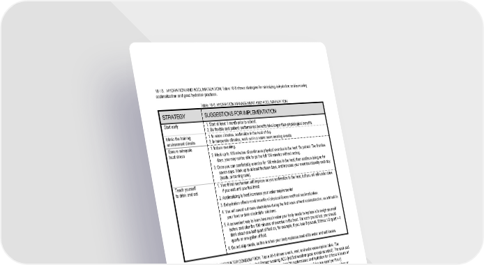 16 - 9 16-15. HYDRATION AND ACCLIMATIZATION. Table 16-5 shows strategies for minimizing dehydration and increasing acclimatization and good hydration practices. Table 16-5. HYDRATION MANAGEMENT AND ACCLIMATIZATION STRATEGY SUGGESTIONS FOR IMPLEMENTATION Start early 1. Start at least 1 month prior to school. 2. Be flexible and patient: performance benefits take longer than physiological benefits. Mimic the training environment climate 1. In warm climates, acclimatize in the heat of day. 2. In temperate climates, work out in a warm room wearing sweats. Ensure adequate heat stress 1. Induce sweating. 2. Work up to 100 minutes of continuous physical exercise in the heat. Be patient. The first few days, you may not be able to go the full 100 minutes without resting. 3. Once you can comfortably exercise for 100 minutes in the heat, then continue doing so for seven days. Work up to at least fourteen days, and increase your exercise intensity each day (loads, or training runs). Teach yourself to drink and eat 1. Your thirst mechanism will improve as you acclimatize to the heat, but you will still under drink if you wait until you feel thirst. 2. Acclimatizing to heat increases your water requirements! 3. Dehydration offsets most benefits of physical fitness and heat acclimatization. 4. You will sweat out more electrolytes during the first week of heat acclimatization, so add salt to your food or drink electrolyte solutions. 5. A convenient way to learn how much water your body needs to replace is to weigh yourself before and after the 100 minutes of exercise in the heat. For each pound lost, you should drink about one-half quart of fluid so, for example, if you lose 8 pounds, 8 times 1/2 quart = 4 quarts or one gallon of fluid. 6. Do not skip meals, as this is when your body replaces most of its water and salt losses. 16-16. WORK, REST, AND WATER CONSUMPTION. Table 16-6 shows a work, rest, and water consumption table. The guidance applies to the average size, heat-acclimated Ranger wearing ACU (not hot weather gear, except as noted). The work and rest times and fluid replacement volumes shown will help the Ranger sustain his performance and hydration for at least 4 hours of work in the specified heat category. Fluid needs can vary based on individual differences (give or take one quart per hour). a. "NL" means that there is no limit to work time per hour. "Rest" means minimal physical activity such as sitting or standing, preferably in the shade. b. Consume no more than 1.5 quarts of fluid per hour, and no more than 12 quarts per day. c. If you are wearing body armor in a humid climate, then add 5º F to the WBGT. If wearing MOPP 4 clothing, add 10º F to the WBGT. d. Work categories include easy, moderate, and hard. 1) Easy Work. This includes, for example, maintaining weapons; walking on hard surfaces at 2.5 mph with a load of no more than 30 pounds; participating in marksmanship training; and participating in drills or ceremonies. 2) Moderate Work. This includes, for example, walking in loose sand at 2.5 mph (maximum) or with no load; walking on a hard surface at 3.5 mph (maximum) with a load weighing no more than 40 pounds; performing calisthenics; patrolling; or conducting individual movement techniques such as the low or high crawl. 3) Hard Work. This includes, for example, walking on a hard surface at 3.5 mph with a load weighing 40 or more pounds; walking in loose sand at 2.5 mph while carrying a load; and conducting field assaults.
