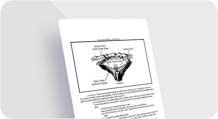 14 - 9 Figure 14-5. SURVIVAL WATER STILL j. Plant Food. There are many plants throughout the world. Tasting or swallowing even a small portion of some can cause severe discomfort, extreme internal disorders, or death. Therefore, if you have the slightest doubt as to the edibility of a plant, apply the universal edibility test described below before eating any part of it. (1) Universal Edibility Test. Before testing a plant for edibility, make sure there are a sufficient number of plants to make testing worth your time and effort. You need more than 24 hours to apply the edibility test outlined below: • Test only one part of a potential food plant at a time. • Break the plant into its basic components, leaves, stems, roots, buds, and flowers. • Smell the food for strong or acid odors. Keep in mind that smell alone does not indicate a plant is edible. • Do not eat for 8 hours before starting the test. • During the 8 hours you are abstaining from eating, test for contact poisoning by placing a piece of the plant you are testing on the inside of your elbow or wrist. Usually 15 minutes is enough time to allow for reaction. • During the test period, take nothing by mouth except purified water and the plant part being tested. • Select a small portion and prepare it the way you plan to eat it. • Before putting the prepared plant part in your mouth, touch a small portion (a pinch) to the outer surface of the lip to test for burning or itching. • If after 3 minutes there is no reaction on your lip, place the plant part on your tongue, holding there for 15 minutes. • If there is no reaction, thoroughly chew a pinch and hold it in your mouth for 15 minutes. Do not swallow. • If no burning, itching, numbing, stinging, or other irritation occurs during the 15 minutes, swallow the food. • Wait 8 hours. If any ill effects occur during this period, induce vomiting and drink a lot of water. • If no ill effects occur, eat 1/ 2 cup of the same plant part prepared the same way. Wait another 8 hours. If no ill effects occur, the plant part as prepared is safe for eating.