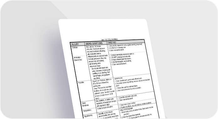 16 - 5 Table 16-3. COLD INJURIES INJURY SIGNS/ SYMPTOMS FIRST AID Chilblain Red, swollen, hot, tender, itchy skin. Continued exposure may lead to infected (bleeding, ulcerated) skin lesions. 1. Area usually responds to locally applied warming (body heat). 2. Do Not rub or massage area. 3. Seek medical treatment. Immersion (trench) foot Affected parts are cold and numb. As body parts warm, they may become hot, with burning and shooting pains. Advanced stage: Skin is pale with bluish cast; pulse decreases; blistering and swelling occur, swelling, heat hemorrhages, and gangrene may follow. 1. Gradual warming by exposure to warm air. 2. DO NOT massage or moisten skin. 3. Protect affected parts from trauma. 4. Dry feet thoroughly: avoid walking. 5. Seek medical treatment. Frostbite Superficial: Redness, blisters in 24 to 36 hours followed by peeling skin Deep: Preceded by superficial frostbite; skin is painless, pale- yellowish, waxy, “wooden” or solid to touch, blisters form in 12-36 hours SUPERFICIAL 1. Keep casualty warm; gently warm affected parts. 2. Decrease constricting clothing, increase exercise and insulation. DEEP 1. Protect the part from additional injury. 2. Seek medical treatment as fast as possible. Snow Blindness Red, scratchy, or watery eyes; headache; increased pain in eyes with exposure to light. 1. Cover the eyes with a dark cloth. 2. Seek medical treatment. Dehydration Similar to heat exhaustion. 1. Keep warm, loosen clothes. 2. Replace lost fluids, rest, and additional medical treatment. Hypothermia Casualty is cold, shivers uncontrollably until shivering stops. A core (rectal) temp below 95° F can affect consciousness. Uncoordinated movements, shock, and coma may occur as body temperature drops. MILD HYPOTHERMIA 1. Warm body evenly and without delay. (Heat source must be provided.) 2. Keep dry, protect from elements. 3. Warm liquids may be given to conscious casualty only. 4. Be prepared to start CPR. 5. Seek medical treatment immediately. SEVERE HYPOTHERMIA 1. Quickly stabilize body temperature. 2. Attempt to prevent further heat loss. 3. Handle the casualty gently. 4. Evacuate to nearest medical treatment facility as soon as possible.