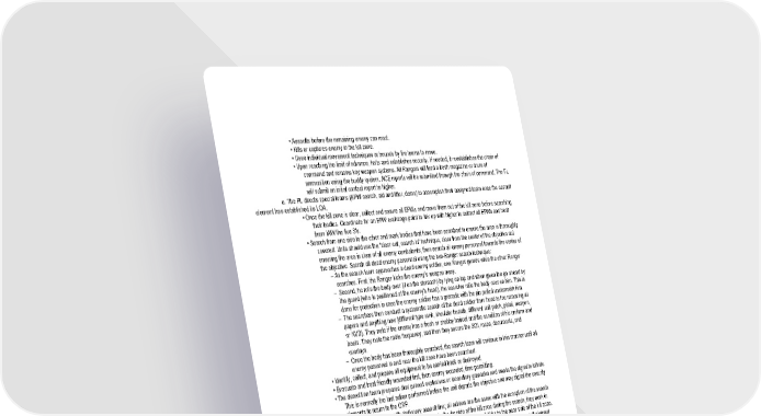 • Assaults before the remaining enemy can react. • Kills or captures enemy in the kill zone. • Uses individual movement techniques or bounds by fire teams to move. • Upon reaching the limit of advance, halts and establishes security. If needed, it reestablishes the chain of command and remains key weapon systems. All Rangers will load a fresh magazine or drum of ammunition using the buddy system. ACE reports will be submitted through the chain of command. The PL will submit an initial contact report to higher. o. The PL directs special teams (EPW search, aid and litter, demo) to accomplish their assigned tasks once the assault element has established its LOA. • Once the kill zone is clear, collect and secure all EPWs and move them out of the kill zone before searching their bodies. Coordinate for an EPW exchange point to link up with higher to extract all EPWs and treat them IAW the five S's. • Search from one side to the other and mark bodies that have been searched to ensure the area is thoroughly covered. Units should use the “clear out, search in” technique, clear from the center of the objective out ensuring the area is clear of all enemy combatants; then search all enemy personnel towards the center of the objective. Search all dead enemy personnel using the two-Ranger search technique: – As the search team approaches a dead enemy soldier, one Ranger guards while the other Ranger searches. First, the Ranger kicks the enemy’s weapon away. – Second, he rolls the body over (if on the stomach) by lying on top and when given the go ahead by the guard (who is positioned at the enemy's head), the searcher rolls the body over on him. This is done for protection in case the enemy soldier has a grenade with the pin pulled underneath him. – The searchers then conduct a systematic search of the dead soldier from head to toe removing all papers and anything new (different type rank, shoulder boards, different unit patch, pistol, weapon, or NVD). They note if the enemy has a fresh or shabby haircut and the condition of his uniform and boots. They note the radio frequency, and then they secure the SOI, maps, documents, and overlays. – Once the body has been thoroughly searched, the search team will continue in this manner until all enemy personnel in and near the kill zone have been searched. • Identify, collect, and prepare all equipment to be carried back or destroyed. • Evacuate and treat friendly wounded first, then enemy wounded, time permitting. • The demolition team prepares dual primed explosives or incendiary grenades and awaits the signal to initiate. This is normally the last action performed before the unit departs the objective and may signal the security elements to return to the ORP. • Actions on the objective with stationary assault line; all actions are the same with the exception of the search teams. To provide security within the teams to the far side of the kill zone during the search, they work in three Ranger teams. Before the search begins, the Rangers move all KIAs to the near side of the kill zone. p. If enemy reinforcements try to penetrate the kill zone, the flank security will engage to prevent the assault element from being compromised. q. The platoon leader directs the unit’s withdrawal from the ambush site: • Elements normally withdraw in the reverse order that they established their positions. • The elements may return to the RP or directly to the ORP, depending on the distance between elements. • The security element of the ORP must be alert to assist the platoon’s return to the ORP. It maintains security for the ORP while the rest of the platoon prepares to leave. • If possible, all elements should return to the location at which they separated from the main body. This location should usually be the RP. r. The PL and PSG direct actions at the ORP, to include accountability of personnel and equipment and recovery of rucksacks and other equipment left at the ORP during the ambush. s. The platoon leader disseminates information, or moves the platoon to a safe location (no less than one kilometer or one terrain feature away from the objective) and disseminates information. t. As required, the PL and FO execute indirect fires to cover the platoon’s withdrawal.