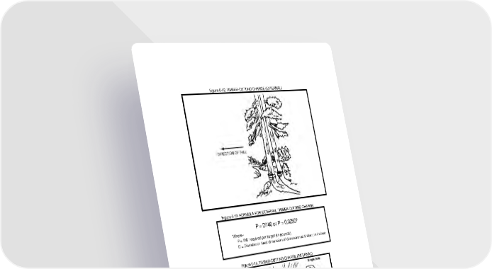 5 - 13 Figure 5-12. TIMBER-CUTTING CHARGE (EXTERNAL) Figure 5-13. FORMULA FOR EXTERNAL TIMBER-CUTTING CHARGE P = D²/40 or P = 0.025D² Where– P = TNT required per target (in pounds) D = Diameter or least dimension of dimensioned timber; in inches Figure 5-14. TIMBER-CUTTING CHARGE (INTERNAL)