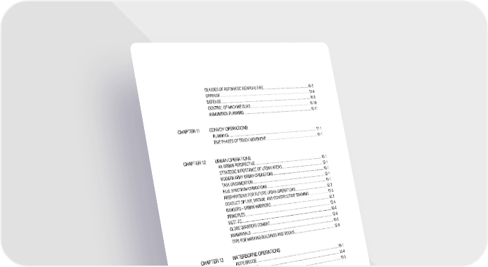 ix CLASSES OF AUTOMATIC WEAPONS FIRE .............................................................. 10-3 OFFENSE ........................................................................................................................ 10-8 DEFENSE ........................................................................................................................ 10-9 CONTROL OF MACHINE GUNS.................................................................................. 10-10 AMMUNITION PLANNING ............................................................................................ 10-11 CHAPTER 11 CONVOY OPERATIONS PLANNING ....................................................................................................................... 11-1 FIVE PHASES OF TRUCK MOVEMENT ....................................................................... 11-1 CHAPTER 12 URBAN OPERATIONS AN URBAN PERSPECTIVE ............................................................................................ 12-1 STRATEGIC IMPORTANCE OF URBAN AREAS ......................................................... 12-1 MODERN ARMY URBAN OPERATIONS ...................................................................... 12-1 TASK ORGANIZATION ................................................................................................... 12-1 FULL SPECTRUM OPERATIONS ................................................................................. 12-1 PREPARATIONS FOR FUTURE URBAN OPERATIONS ............................................ 12-2 CONDUCT OF LIVE, VIRTUAL, AND CONSTRUCTIVE TRAINING ........................... 12-3 RANGERS – URBAN WARRIORS ................................................................................. 12-3 PRINCIPLES .................................................................................................................... 12-4 METT-TC .......................................................................................................................... 12-4 CLOSE QUARTERS COMBAT ....................................................................................... 12-6 REHEARSALS ................................................................................................................. 12-6 TTPS FOR MARKING BUILDINGS AND ROOMS ........................................................ 12-8 CHAPTER 13 WATERBORNE OPERATIONS ROPE BRIDGE ................................................................................................................ 13-1 PONCHO RAFT ............................................................................................................... 13-4 OTHER WATERCRAFT .................................................................................................. 13-5 CHAPTER 14 EVASION/SURVIVAL EVASION PLANNING CONSIDERATIONS .................................................................................... 14-1 INITIAL EVASION POINT ............................................................................................... 14-1 EVASION MOVEMENT ................................................................................................... 14-1 ROUTES .......................................................................................................................... 14-1 COMMUNICATIONS ....................................................................................................... 14-2 HIDE SITE ........................................................................................................................ 14-2 HOLE-UP AREA .............................................................................................................. 14-2 CAMOUFLAGE ................................................................................................................ 14-2