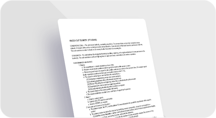 8 - 15 KNOCK OUT BUNKER (07-3-D9406) CONDITIONS (CUE) —The unit moves tactically, conducting operations. The enemy initiates contact from concealed bunker network. All or part of the unit is receiving accurate enemy direct fire. Some iterations of this task should be performed in MOPP4. The unit receives an order to knock out an enemy bunker from which it is receiving fire. STANDARDS—The unit destroys the designated bunker(s) by killing, capturing, or forcing the withdrawal of enemy personnel in the bunker(s). The unit maintains a sufficient fighting force to repel an enemy counterattack and continue operations. PERFORMANCE MEASURES 1. Deploy a. The squad/team in contact establishes a base of fire. b. Weapons squad leader positions machine gun(s) to reinforce rifle squad in contact. c. Platoon sergeant moves to support by fire position and assumes control of the position's fires. (The weapon squad leader repositions another machine gun, as needed, based on METT-TC). d. The squad in contact gains and maintains fire superiority by— (1) Destroying or suppressing enemy crew served weapons. (2) Continuing suppressive fires at the lowest possible level. (3) [Platoon FO] calling for and adjusting indirect fires as directed by the platoon leader. (4) Suppressing the bunker and any supporting positions. (5) [Squad] employing shoulder-launched munitions as required. e. The squad obscures the enemy position with smoke. f. The squad establishes security to rear and flanks of support-by-fire position. 2. Report a. Submits contact reports. b. Submits SALUTE report to commander. c. Submits SITREPs as needed. 3. Evaluate and Develop the Situation a. The platoon leader, his RTO, and the platoon FO move forward to link up with the squad leader of the squad in contact. b. The platoon leader evaluates the situation by identifying enemy's composition, disposition and capabilities— (1) Identifies enemy disposition: number and locations of enemy bunkers, levels of mutual support and overlapping fires between positions, connecting trenches, and protective obstacles. (2) Identifies enemy composition and strength: the number of enemy automatic weapons, the presence of any vehicles, and the employment of indirect fires are indicators of enemy strength. (3) Identifies enemy capability to defend, reinforce, attack, and withdraw. c. Platoon leader develops the situation by determining where he can move to a position of advantage. He looks for— (1) A vulnerable flank or blind spot to at least one bunker. (2) A covered and concealed flanking route to the flank of the bunker. 4. Develop a COA a. The platoon leader determines— (1) Which bunker poses the greatest threat. (2) Where the adjoining bunkers are located. (3) Whether to breach protective obstacles. b. Platoon leader determines where to place support positions. c. Platoon leader determines size and make up of assault squad. 5. Execute the COA (Figure 8-13). a. Platoon leader directs the supporting element to suppress bunker as needed— (1) Platoon sergeant repositions a squad, a fire team, or a machine gun team to isolate the bunker and to continue suppressive fires.