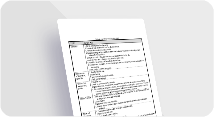 Table 16-4. ENVIRONMENTAL INJURIES TYPE FIRST AID Snake bite 1. Get the casualty away from the snake. 2. Remove all rings and bracelets from the affected extremity. 3. Reassure the casualty and keep him quiet. 4. Apply constricting band(s) 1 to 2 finger widths close to the bite. You should be able to slip 1 finger between the band and skin. ARM OR LEG BITE - Place one band above and one band below the bite site. HAND OR FOOT BITE - Place one band above the wrist or ankle. 5. Immobilize the affected limb below the level of the heart. 6. Kill the snake, if possible, (without damaging its head or endangering yourself) and send it with the casualty. 7. Seek medical treatment immediately. Brown recluse or black widow, spider bite 1. Keep the casualty calm. 2. Wash the area. 3. Apply ice or a freeze pack, if available. 4. Seek medical treatment. Tarantula bite, scorpion sting, ant bite 1. Wash the area. 2. Apply ice or a freeze pack, if available. 3. Apply baking soda, calamine lotion, or meat tenderizer to the bite site to relieve pain and itching. 4. If site of bite(s) or sting(s) is on the face, neck (possible airway blockage), or genital area, or if reaction is severe, or if the sting is by the dangerous Southwestern scorpion, keep the casualty as quiet as possible, administer an antidote if needed and seek immediate medical aid. Wasp or bee sting 1. If the stinger is present, remove by scraping with a knife or finger nail. DO NOT squeeze venom sack on stinger, more venom may be injected. 2. Wash the area. 3. Apply ice or freeze pack, if available. 4. If allergic signs or symptoms appear, be prepared to administer an antidote and seek medical assistance. Human and Other animal Bites 1. Cleanse the wound thoroughly with soap or detergent solution. 2. Flush bite well with water. 3. Cover bite with a sterile dressing. 4. Immobilize injured extremity. 5. Transport casualty to a medical treatment facility. 6. For animal bites, without endangering yourself or damaging the animal's head, kill the animal and send its head with the casualty. 7. For human bites, try to extract some of the attacker's saliva from the wound and send that in a sealed, identified container with the casualty. Poison Ivy, Oak, Sumac 1. Gently clean affected area two to three times daily. Wash clothing. 2. Apply topical anti-itch lotion or ointment as needed, and cover. 3. Avoid scratching the area. 4. Observe for signs of infection (increasing redness, tenderness, warmth to touch). 5. Seek medical attention if rash persists or signs of infection develop.