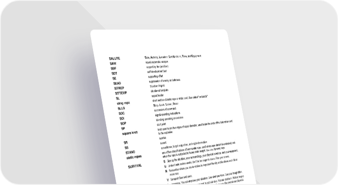 SALUTE Size, Activity, Location, Unit/Uniform, Time, and Equipment SAW squad automatic weapon SBF support by fire (position) SDT self-development test SE supporting effort SEAD suppression of enemy air defenses SITREP Situation Report SITTEMP situational template SL squad leader sling rope short section of static rope or static cord. Also called "cordelette" SLLS Stop, Look, Listen, Smell SOC succession of command SOI signal operating instructions SOP standing operating procedures SP start point square knot knot used to join two ropes of equal diameter; used to join the ends of the detonation cord to the explosive SR sunrise SS sunset STANO surveillance, target acquisition, and night observation static ropes one of two classifications of kernmantle rope; used where rope stretch is undesired, and when the rope is subjected to heavy static weight. See also dynamic rope SURVIVAL S Size up the situation, your surroundings, your physical condition, and your equipment. U Undue haste makes waste; don’t be too eager to move. Plan your moves. R Remember where you are in relation to important friendly and locations and critical resources V Vanquish fear and panic. I Improvise. You can improve your situation. Use what you have. Use your Imagination. V Value your life. Remember your goal: to get out alive. Remain stubborn. Refuse to give in to problems and obstacles that face you. This will give you the mental and physical strength to endure. A Act like the natives; watch their daily routines. When, where, and how do they get food? Where they get water? L Live by your wits. Learn basic skills. suspension traverse used to move personnel and equipment over rivers, ravines, chasms, and up or down a vertical obstacle TAC tactical air controller tamping factor depends on the location and tamping of the charge technical climbing using safe and proper equipment and techniques to climb on a rock formation in parties of two or more tensionless anchor used to anchor rope on high-load installations such as bridging