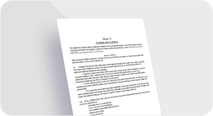 14 - 1 Chapter 14 EVASION AND SURVIVAL This chapter will cover basic materials dealing with evading the enemy and survival techniques. It covers field-expedient methods of acquiring food and water; land navigation; construction of shelters; and fire-starting techniques. See also FM 3-05.70 (Survival) and FM 3-55.93 (Long-Range Surveillance Unit Operations). Section I. EVASION When you become isolated or separated in a hostile area, either as an individual or as a group, your evasion and survival skills will determine whether or not you return to friendly lines. 14-1. PLANNING CONSIDERATIONS. While certain units formally plan for evasion at the receipt of every mission, every leader should have a plan to facilitate the recovery of his personnel should things turn bad. He can use the following methods and materials for both formal and informal evasion planning: a. Construct an evasion plan of action (EPA) for each mission, and give a copy to higher headquarters. At a minimum, include the overall plan; routes; a personnel roster; a list of survival equipment and signaling devices you plan to carry; authentication means (letter of the day, number of the day, word, for example), and your evasion intentions, should the situation arise (initial, immediate less than 48 hrs, and extended more than 48 hrs). b. Prior to initiating movement, review the Air Tasking Order Special Instructions (ATOSPINS), ISOPREP cards, info on operational environment (cultural boundaries, social or political events, and norms and trends), and have everyone “sterilize” their personal effects. c. You can get other evasion aids through higher headquarters. These include evasion charts (EVCs), which are maps made of waterproof paper. In the margins, they contain survival information such as edible and poisonous plants. Information cards printed in the destination language and in English are useful for emergency communications with locals. 14-2. INITIAL EVASION POINT. This is when you realize that you have become separated from friendly forces. Here is what to do when you reach this point: • Immediately move to a concealed point • S.L.L.S. (Do at your earliest opportunity) • Try to establish communications with friendly forces • Observe enemy activity • Evaluate the situation • Security, camouflage • Formulate a plan of action • Employ keyword SURVIVAL • Inventory supplies (food, water, equipment) 14-3. EVASION MOVEMENT. Do not move from the area just for something to do. Move only if you have to, in which case, consider the following. Traveling alone offers the least possibility of detection, but traveling in groups of 2 or 3 is more desirable: • Health of evader/ ability to move • Enemy activity • Recovery potential 14-4. ROUTES. Plan primary and alternate routes. Consider distance, cover, food, and water. The easiest and shortest route may not be the best. • Food and water are daily requirements. You can do without food for several days; water, however, is essential. • Move at night. Use the daylight to observe, plan, and rest in a hide position. • Linkup only during daylight hours. Place friendly lines under observation. • Attempt to identify the unit you approach, note their movements and routine.