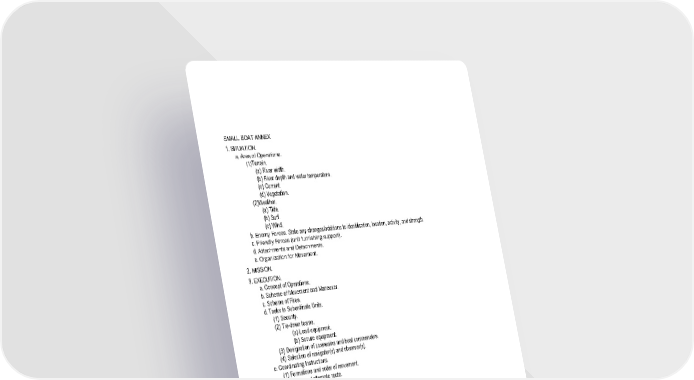 SMALL BOAT ANNEX 1. SITUATION. a. Area of Operations. (1)Terrain. (a) River width. (b) River depth and water temperature. (c) Current. (d) Vegetation. (2)Weather. (a) Tide. (b) Surf. (c) Wind. b. Enemy Forces. State any changes/additions to identification, location, activity, and strength. c. Friendly Forces (unit furnishing support). d. Attachments and Detachments. e. Organization for Movement. 2. MISSION. 3. EXECUTION. a. Concept of Operations. b. Scheme of Movement and Maneuver. c. Scheme of Fires. d. Tasks to Subordinate Units. (1) Security. (2) Tie-down teams. (a) Load equipment. (b) Secure equipment. (3) Designation of coxswains and boat commanders. (4) Selection of navigator(s) and observer(s). e. Coordinating Instructions. (1) Formations and order of movement. (2) Route and alternate route. (3) Method of navigation. (4) Actions on enemy contact. (5) Rally points. (6) Embarkation plan. (7) Debarkation plan. (8) Rehearsals. (9) Time schedule. 4. SUSTAINMENT. Only brief specifics not covered in base order. a. Logistics. (1) Sustainment Overlay. (2) Maintenance. (3) Transportation. Include disposition of boats, paddles, and life jackets upon debarkation. (4) Supply. Class I: Class III: Class V: