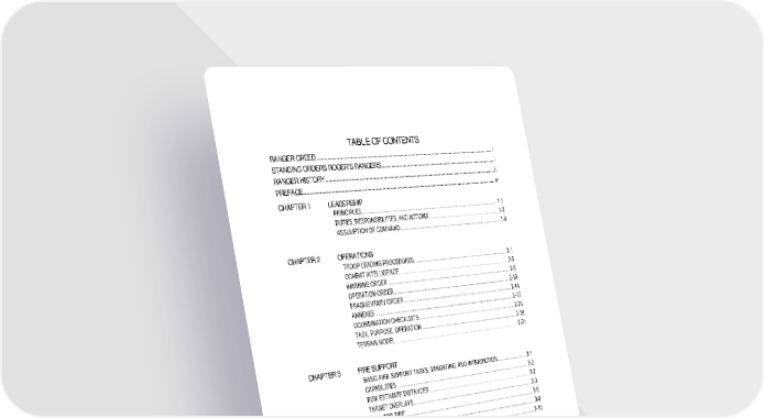 TABLE OF CONTENTS RANGER CREED ............................................................................................................................... i STANDING ORDERS ROGER’S RANGERS .................................................................................... i RANGER HISTORY ........................................................................................................................... ii PREFACE.......................................................................................................................................... vi CHAPTER 1 LEADERSHIP PRINCIPLES ...................................................................................................................... 1-1 DUTIES, RESPONSIBILITIES, AND ACTIONS............................................................... 1-2 ASSUMPTION OF COMMAND ........................................................................................ 1-8 CHAPTER 2 OPERATIONS TROOP-LEADING PROCEDURES .................................................................................. 2-1 COMBAT INTELLIGENCE ................................................................................................ 2-5 WARNING ORDER ........................................................................................................... 2-6 OPERATION ORDER...................................................................................................... 2-10 FRAGMENTARY ORDER ............................................................................................... 2-14 ANNEXES ........................................................................................................................ 2-17 COORDINATION CHECKLISTS..................................................................................... 2-25 TASK, PURPOSE, OPERATION .................................................................................... 2-30 TERRAIN MODEL ........................................................................................................... 2-31 CHAPTER 3 FIRE SUPPORT BASIC FIRE SUPPORT TASKS, TARGETING, AND INTERDICTION .......................... 3-1 CAPABILITIES ................................................................................................................... 3-2 RISK ESTIMATE DISTANCES ......................................................................................... 3-2 TARGET OVERLAYS ........................................................................................................ 3-3 CALL FOR FIRE ................................................................................................................ 3-5 CLOSE AIR SUPPORT ..................................................................................................... 3-8 CLOSE COMBAT ATTACK AVIATION .......................................................................... 3-10 CHAPTER 4 COMMUNICATIONS EQUIPMENT MILITARY RADIOS ........................................................................................................... 4-1 MAN-PACK RADIO ASSEMBLY (AN/PRC-119F) ........................................................... 4-4 AUTOMATED NET-CONTROL DEVICE .......................................................................... 4-5 BASIC TROUBLESHOOTING .......................................................................................... 4-6 ANTENNAS REPAIRS ............................................................................................................................ 4-6 CONSTRUCTION AND ADJUSTMENT ........................................................................... 4-7 FIELD EXPEDIENT (FE) OMNI DIRECTIONAL ANTENNAS ......................................... 4-8