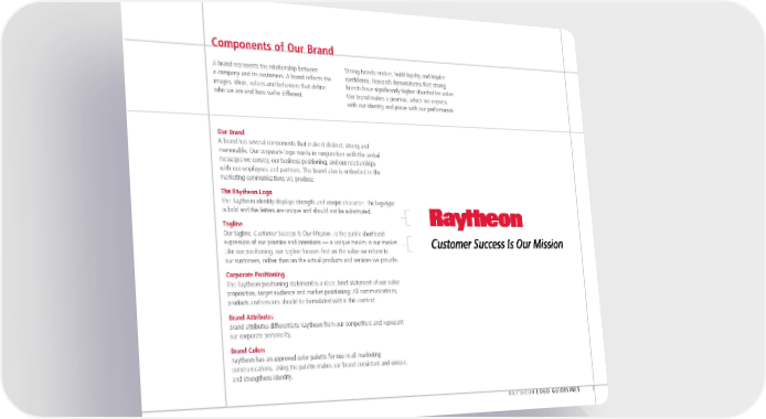 Components of Our Brand A brand represents the relationship between Strong brands endure, build loyalty and inspire a company and its customers. A brand reflects the confidence. Research demonstrates that strong images, ideas, values and behaviors that define brands have significantly higher shareholder value. who we are and how we’re different. Our brand makes a promise, which we express with our identity and prove with our performance. Our Brand A brand has several components that make it distinct, strong and memorable. Our corporate logo works in conjunction with the verbal messages we convey, our business positioning, and our relationships with our employees and partners. The brand also is embodied in the marketing communications we produce. The Raytheon Logo The Raytheon identity displays strength and unique character. The logotype is bold and the letters are unique and should not be substituted. Tagline Our tagline, Customer Success Is Our Mission, is the public shorthand expression of our promise and intentions — a unique maxim in our market. Like our positioning, our tagline focuses first on the value we return to our customers, rather than on the actual products and services we provide. Corporate Positioning The Raytheon positioning statement is a clear, brief statement of our value proposition, target audience and market positioning. All communications, products and services should be formulated within this context. Brand Attributes Brand attributes differentiate Raytheon from our competitors and represent our corporate personality. Brand Colors Raytheon has an approved color palette for use in all marketing communications. Using the palette makes our brand consistent and unique, and strengthens identity. RAYTHEON LOGO GUIDELINES 3