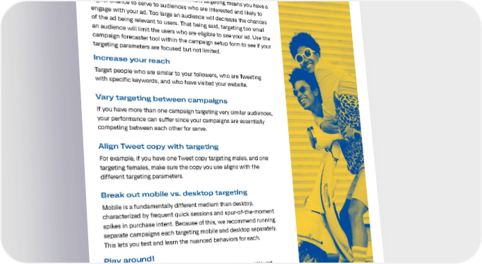 Audience targeting Other targeting tips to optimize your campaign Target with focus Creating campaigns with focused, relevant targeting means you have a higher chance to serve to audiences who are interested and likely to engage with your ad. Too large an audience will decrease the chances of the ad being relevant to users. That being said, targeting too small an audience will limit the users who are eligible to see your ad. Use the campaign forecaster tool within the campaign setup form to see if your targeting parameters are focused but not limited. Increase your reach Target people who are similar to your followers, who are Tweeting with specific keywords, and who have visited your website. Vary targeting between campaigns If you have more than one campaign targeting very similar audiences, your performance can suffer since your campaigns are essentially competing between each other for serve. Align Tweet copy with targeting For example, if you have one Tweet copy targeting males, and one targeting females, make sure the copy you use aligns with the different targeting parameters. Break out mobile vs. desktop targeting Mobile is a fundamentally different medium than desktop, characterized by frequent quick sessions and spur-of-the-moment spikes in purchase intent. Because of this, we recommend running separate campaigns each targeting mobile and desktop separately. This lets you test and learn the nuanced behaviors for each. Play around! One of the most important things you can do to drive continued campaign performance is to test what works for you and your campaigns. While it makes sense to run always-on campaigns, you’ll want to continually refresh and optimize your campaigns, given Twitter’s ever-changing, real-time nature. Remove low performing keywords, interests, and handles, and replace them with ones that are similar to the high performing ones. 18