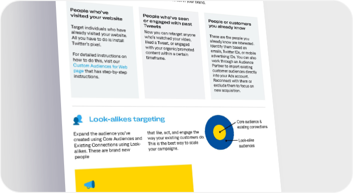Audience targeting Existing connections targeting Yes, Core Audience Targeting is a big help in finding a large and relevant audience. But maybe you’re looking for a more specific group of people? Here’s where you find people who have already shown interest in your brand. People who’ve People who’ve seen People or customers visited your website or engaged with past you already know Tweets Target individuals who have Now you can retarget anyone These are the people you already visited your website. who’s watched your video, already know are interested. All you have to do is install liked a Tweet, or engaged Identify them based on Twitter’s pixel. with your organic/promoted emails, Twitter IDs, or mobile content within a certain advertising IDs. You can also For detailed instructions on timeframe. work through an Audience how to do this, visit our Partner to import existing Custom Audiences for Web customer audiences directly page that has step-by-step into your Ads account. instructions. Reconnect with them or exclude them to focus on new acquisition. Look-alikes targeting Core audience & existing connections Expand the audience you’ve that like, act, and engage the created using Core Audiences and way your existing customers do. Existing Connections using Look- This is the best way to scale Look-alike alikes. These are brand new your campaigns. audiences people Pro Tip #2 Have more questions about targeting? Visit our detailed Q&As on: Device targeting | Geo, gender, and language targeting | Interest and follower targeting | Keyword targeting | Custom Audiences 17