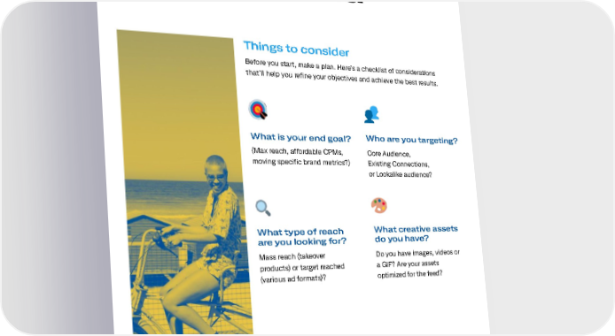 How to get started Things to consider Before you start, make a plan. Here’s a checklist of considerations that’ll help you refine your objectives and achieve the best results. What is your end goal? Who are you targeting? (Max reach, affordable CPMs, Core Audience, moving specific brand metrics?) Existing Connections, or Lookalike audience? What type of reach What creative assets are you looking for? do you have? Mass reach (takeover Do you have images, videos or products) or target reached a GIF? Are your assets (various ad formats)? optimized for the feed? 05