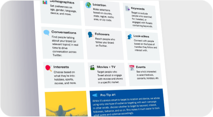 Audience targeting Core audience targeting Looking to reach the right people at scale? Start here. Core Audience targeting allows you to set parameters to find your ideal audience. Demographics Location Keywords Set preferences on Make selections Target or exclude age, gender, language, based on country, people who searched device, and more. state, region, metro for, tweeted, or area, or zip code. engaged with Tweets containing keywords. Conversations Followers Look-alikes Find people talking Reach people who Connect with people about your brand (or follow your brand based on the types of relevant topics) in real on Twitter. handles they follow and time to drive interact with. conversation across Twitter. Interests Movies + TV Events Choose based on Target people who See who’s interested what they’re into: Tweet about or engage in select festivals, hobbies, sports, with movies and shows concerts, holidays, etc. movies, and more. in a specific market. Pro Tip #1 While it’s always smart to target by location and device, we advise using only one type of audience targeting with each campaign. In other words, choose whether to target by keyword, interest, followers, behavior, and so on. This makes it much easier to track what works and optimize accordingly. All of our Demographic Audience Action based targeting tactics, Targeting tactics including Age, including Keywords, Interests, Gender, Location, Device, Follower Look-alikes, and Language, and Carrier will apply Conversations, a person can only to every person targeted in your be targeted by your campaign campaign. For our Interest and based on a single parameter, not multiple. 16