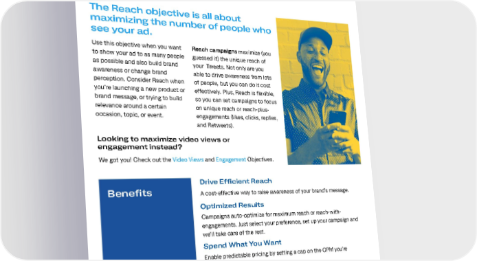 Overview The Reach objective is all about maximizing the number of people who see your ad. Use this objective when you want Reach campaigns maximize (you to show your ad to as many people guessed it) the unique reach of as possible and also build brand your Tweets. Not only are you awareness or change brand able to drive awareness from lots perception. Consider Reach when of people, but you can do it cost you’re launching a new product or effectively. Plus, Reach is flexible, brand message, or trying to build so you can set campaigns to focus relevance around a certain on unique reach or reach-plus- occasion, topic, or event. engagements (likes, clicks, replies, and Retweets). Looking to maximize video views or engagement instead? We got you! Check out the Video Views and Engagement Objectives. Drive Efficient Reach Benefits A cost-effective way to raise awareness of your brand’s message. Optimized Results Campaigns auto-optimize for maximum reach or reach-with- engagements. Just select your preference, set up your campaign and we’ll take care of the rest. Spend What You Want Enable predictable pricing by setting a cap on the CPM you're comfortable paying. Flexible The Reach objective is compatible with all of Twitter’s targeting & ad formats. 03