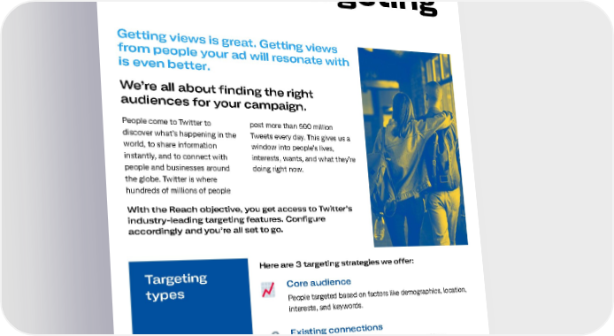 Audience targeting Getting views is great. Getting views from people your ad will resonate with is even better. We’re all about finding the right audiences for your campaign. People come to Twitter to post more than 500 million discover what’s happening in the Tweets every day. This gives us a world, to share information window into people’s lives, instantly, and to connect with interests, wants, and what they’re people and businesses around doing right now. the globe. Twitter is where hundreds of millions of people With the Reach objective, you get access to Twitter’s industry-leading targeting features. Configure accordingly and you’re all set to go. Here are 3 targeting strategies we offer: Targeting types Core audience People targeted based on factors like demographics, location, interests, and keywords. Existing connections Reach people who are already familiar with and have expressed interest in your brand on or off Twitter. Look-alikes Discover brand new people with habits, interests, and backgrounds similar to your existing followers or customers. 15