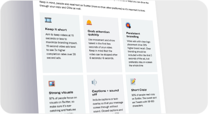 Ad creative & copy Creative best practices Ad creative is the #1 factor in driving sales. In fact, according to Nielsen, 47% of sales can be attributed to creative alone. After reviewing thousands of campaigns, we’ve put together a list of ways you can drive the best return for ads. Keep in mind, people also read text on Twitter (more so than other platforms) so it’s important to think through your copy and CTAs as well. Keep it short Grab attention Persistent Aim to keep videos at 15 quickly branding seconds or less to Use movement and show Video ads with clear logo maximize branding impact. talent in the first few placement drive 36% 15 second video ads tend seconds of your video. higher brand recall. Clear to see 3x higher Keep in mind that the branding should be completion rates over 30 video can be skipped after included within the first 3 second ads. 6 seconds.r 6 seconds. seconds of the ad, but preferably stay on-screen the whole time Strong visuals Captions + sound Short Copy 97% of people focus on off 90% of people read copy visuals on Twitter, so Include captions or text- on Twitter. The sweet spot make sure it’s eye- overlay so that your message are Tweets with 50-100 catching and features comes through without characters. your product or key sound. Closed captions and message. text overlays create 28% longer view times on Twitter and Average ROI is 1.8x higher for videos that don’t require sound to be understood. Source: Nielsen Catalina Solutions, 5 Keys to Advertising Effectiveness, Oct 2017 13
