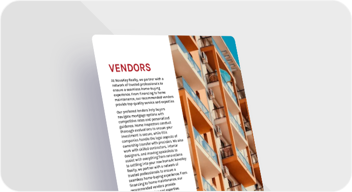 VENDORS At NovaKey Realty, we partner with a network of trusted professionals to ensure a seamless home-buying experience. From financing to home maintenance, our recommended vendors provide top-quality service and expertise. Our preferred lenders help buyers navigate mortgage options with competitive rates and personalized guidance. Home inspectors conduct thorough evaluations to ensure your investment is secure, while title companies handle the legal aspects of ownership transfer with precision. We also work with skilled contractors, interior designers, and moving specialists to assist with everything from renovations to settling into your new home.At NovaKey Realty, we partner with a network of trusted professionals to ensure a seamless home-buying experience. From financing to home maintenance, our recommended vendors provide top-quality service and expertise. With NovaKey Realty’s vendor network, you’ll have reliable professionals by your side at every stage of the journey, making home buying as stress-free as possible.