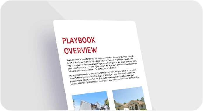PLAYBOOK OVERVIEW Buying a home is one of the most exciting and important decisions you'll ever make. At NovaKey Realty, we’ve created this Buyer Success Playbook to guide you through every step of the journey—from understanding the market to getting the keys to your new home. With expert advice, proven strategies, and insider tips, you’ll gain the confidence to make informed decisions and secure the perfect home with ease. Our approach is centered on you—your needs, your goals, and your vision for the perfect home. Whether you're a first-time buyer or looking to invest in your next property, we provide expert advice, market insights, and a seamless experience tailored to your journey. With the right strategies and support, your dream home is closer than you think. From modern city lofts to serene suburban retreats, NovaKey Realty specializes in finding homes that match your lifestyle, budget, and dreams.