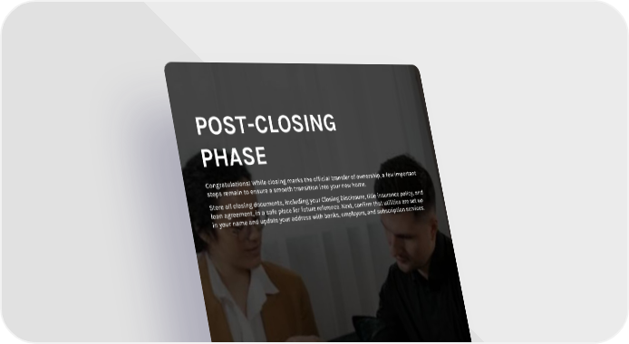 Video POST-CLOSING PHASE Congratulations! While closing marks the official transfer of ownership, a few important steps remain to ensure a smooth transition into your new home. Store all closing documents, including your Closing Disclosure, title insurance policy, and loan agreement, in a safe place for future reference. Next, confirm that utilities are set up in your name and update your address with banks, employers, and subscription services.