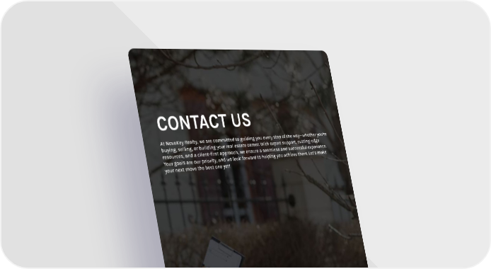 CONTACT US At NovaKey Realty, we are committed to guiding you every step of the way—whether you’re buying, selling, or building your real estate career. With expert support, cutting-edge resources, and a client-first approach, we ensure a seamless and successful experience. Your goals are our priority, and we look forward to helping you achieve them. Let’s make your next move the best one yet! NovaKey Realty 1234 Summit Avenue, Suite 500 Rivertown, NY 10501 Phone: (555) 987-6543 Email: contact@novakeyrealty.com Website: www.novakeyrealty.com