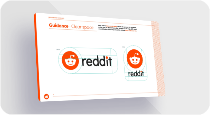 5 Guidance ยท Clear space 140% 140% Make sure to leave enough space around the icon and the wordmark, so that they are distinct from other elements on the page. Safe space around the icon and lockups should be at least 140% of the icon size . REDDIT BRAND GUIDELINES