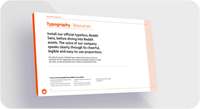 31 Typography · Resources Install our official typeface, Reddit Sans, before diving into Reddit assets. The voice of our company speaks clearly through its cheerful, legible and easy-to-use proportions. The default versions of Reddit Sans contain all four flavor variants as Opentype Sets for applications that support OpenType features. For other use cases, we also provide the flavor variants as separate font files. • Unzip the downloaded file and inside the folder you will find your font files. • Install the fonts by double-clicking them and choosing “Install,” or use your choice of type management software and manually add the fonts. • Be sure to restart browsers, presentation software, creative apps, and other font- dependent resources before you begin using Reddit Sans. If you do not have Reddit Sans installed on your device REDDIT BRAND GUIDELINES