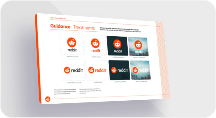 VERTICAL LOCKUP HORIZONTAL LOCKUP SINGLE COLOR SINGLE COLOR DARK BACKGROUND DARK BACKGROUND PHOTO BACKGROUND PHOTO BACKGROUND 6 Guidance ยท Treatments Whenever possible, use a Snoo head icon lockup with the wordmark. The Snoo icon can only be used alone on our platform or as a share icon. Otherwise it should always be accompanied by the wordmark or alongside headlines or other copy mentioning Reddit explicitly. The Snoo head should always appear blank or neutral with darker eyes and mouth. Never invert the Snoo icon. Lorem ipsum dolor sit amet, consectetuer adipiscing elit, sed diam nonummy nibh euismod tincidunt ut laoreet dolore magna REDDIT BRAND GUIDELINES