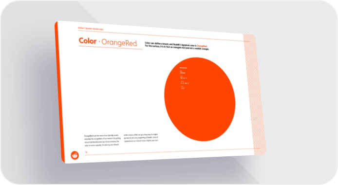 Color can define a brand, and Reddit’s signature color is OrangeRed . For the curious, it is in fact an orangish red (and not a reddish orange). OrangeRed is at the core of our identity and is essential for recognition of our brand. Everything visual that Reddit produces should employ the color in some capacity. It is strong and vibrant, which means a little can go a long way. Its origins go back to the very beginning of Reddit, where it appeared as our mascot Snoo’s original eye color. Color · OrangeRed 16 ORANGERED HEX #FF4500 RGB 255 · 69 · 0 CMYK 0 · 73 · 100 · 0 PMS 172C REDDIT BRAND GUIDELINES