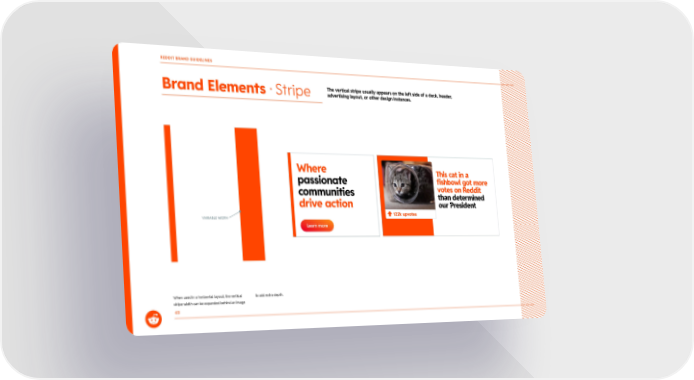 The vertical stripe usually appears on the left side of a deck, header, advertising layout, or other design instances. Brand Elements ยท Stripe 43 When used in a horizontal layout, the vertical stripe width can be expanded behind an image to add extra depth. Where passionate communities drive action Learn more VARIABLE WIDTH 122k upvotes This cat in a fishbowl got more votes on Reddit than determined our President REDDIT BRAND GUIDELINES