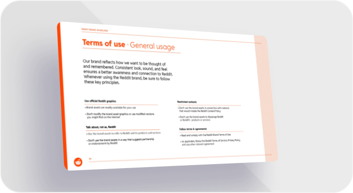 Use official Reddit graphics • Brand assets are readily available for your use • Don’t modify the brand asset graphics or use modified versions you might find on the internet Talk about, not as, Reddit • Use the brand assets to refer to Reddit and its products and services • Don’t use the brand assets in a way that suggests partnership or endorsement by Reddit Restricted contexts • Don’t use the brand assets in connection with material that would violate the Reddit Content Policy • Don’t use the brand assets to disparage Reddit or Reddit’s products or services Follow terms & agreements • Read and comply with the Reddit Brand Terms of Use • As applicable, follow the Reddit Terms of Service, Privacy Policy, and any other relevant agreement Terms of use · General usage 53 Our brand reflects how we want to be thought of and remembered. Consistent look, sound, and feel ensures a better awareness and connection to Reddit. Whenever using the Reddit brand, be sure to follow these key principles. REDDIT BRAND GUIDELINES