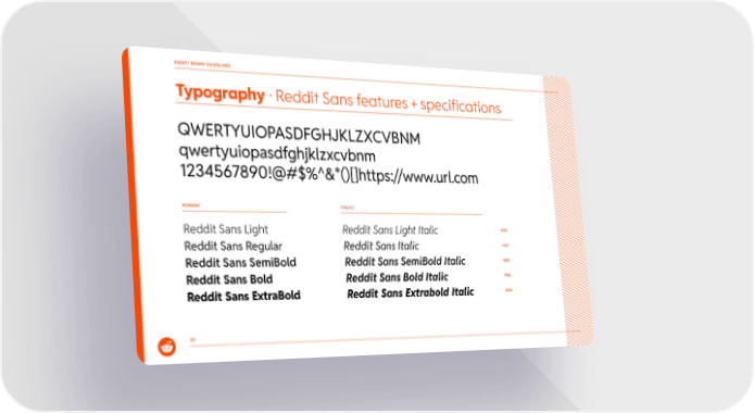 22 Reddit Sans Light Reddit Sans Regular Reddit Sans SemiBold Reddit Sans Bold Reddit Sans ExtraBold QWERTYUIOPASDFGHJKLZXCVBNM qwertyuiopasdfghjklzxcvbnm 1234567890!@#$%^&*()[]https://www.url.com Reddit Sans Light Italic Reddit Sans Italic Reddit Sans SemiBold Italic Reddit Sans Bold Italic Reddit Sans Extrabold Italic 300 400 600 700 800 ROMAN/ ITALIC/ Typography ยท Reddit Sans features + specifications REDDIT BRAND GUIDELINES