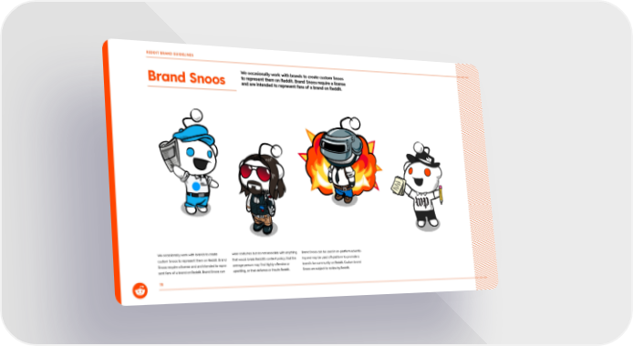 15 Brand Snoos We occasionally work with brands to create custom Snoos to represent them on Reddit. Brand Snoos require a license and are intended to represent fans of a brand on Reddit. We occasionally work with brands to create custom Snoos to represent them on Reddit. Brand Snoos require a license and are intended to repre - sent fans of a brand on Reddit. Brand Snoos can wear costumes but do not associate with anything that would break Reddit’s content policy, that the average person may find highly offensive or upsetting, or that defames or insults Reddit. Brand Snoos can be used in on-platform advertis - ing and may be used off-platform to promote a brand’s fan community on Reddit. Custom brand Snoos are subject to review by Reddit. REDDIT BRAND GUIDELINES