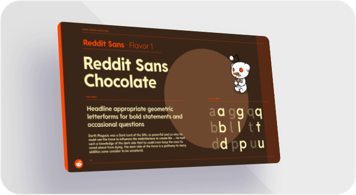 27 Reddit Sans ยท Flavor 1 Reddit Sans Chocolate Headline appropriate geometric letterforms for bold statements and occasional questions Darth Plagueis was a Dark Lord of the Sith, so powerful and so wise he could use the Force to influence the midichlorians to create life ... He had such a knowledge of the dark side that he could even keep the ones he cared about from dying. The dark side of the Force is a pathway to many abilities some consider to be unnatural. a b d a b d g l p g l p q t u q t u SPECIMEN/ LETTERFORMS/ qwertyuiop asdfghjkl zxcvbnm REDDIT BRAND GUIDELINES