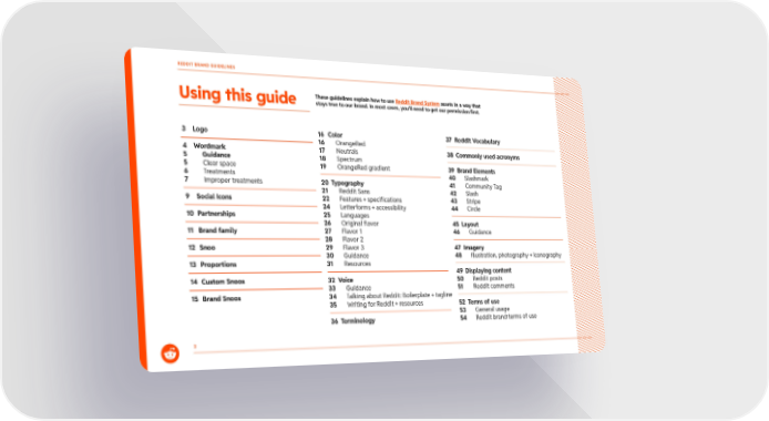 REDDIT BRAND GUIDELINES 2 3 Logo 4 Wordmark 5 Guidance 5 Clear space 6 Treatments 7 Improper treatments 9 Social Icons 10 Partnerships 11 Brand family 12 Snoo 13 Proportions 14 Custom Snoos 15 Brand Snoos 16 Color 16 OrangeRed 17 Neutrals 18 Spectrum 19 OrangeRed gradient 20 Typography 21 Reddit Sans 22 Features + specifications 24 Letterforms + accessibility 25 Languages 26 Original flavor 27 Flavor 1 28 Flavor 2 29 Flavor 3 30 Guidance 31 Resources 32 Voice 33 Guidance 34 Talking about Reddit: Boilerplate + tagline 35 Writing for Reddit + resources 36 Terminology 37 Reddit Vocabulary 38 Commonly used acronyms 39 Brand Elements 40 Slashmark 41 Community Tag 42 Slash 43 Stripe 44 Circle 45 Layout 46 Guidance 47 Imagery 48 Illustration, photography + iconography 49 Displaying content 50 Reddit posts 51 Reddit comments 52 Terms of use 53 General usage 54 Reddit brand terms of use These guidelines explain how to use Reddit Brand System assets in a way that stays true to our brand. In most cases, you’ll need to get our permission first. Using this guide