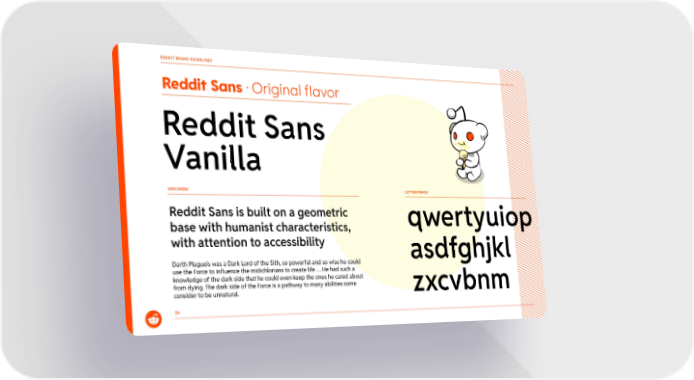 SPECIMEN/ LETTERFORMS/ Reddit Sans is built on a geometric base with humanist characteristics, with attention to accessibility Darth Plagueis was a Dark Lord of the Sith, so powerful and so wise he could use the Force to influence the midichlorians to create life ... He had such a knowledge of the dark side that he could even keep the ones he cared about from dying. The dark side of the Force is a pathway to many abilities some consider to be unnatural. 26 Reddit Sans ยท Original flavor Reddit Sans Vanilla REDDIT BRAND GUIDELINES qwertyuiop asdfghjkl zxcvbnm