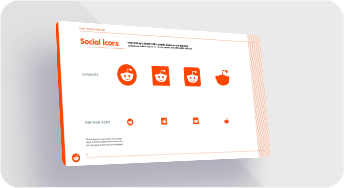 When it appears in color, our icon should always appear in Reddit Orangered (FF4500, PMS 172 C), and never appear at sizes smaller than 24x24 pixels. When linking to Reddit with a graphic, please use our provided social icons, which appear in round, square, and silhouette variants. 9 Social icons MINIMUM 40PX VARIANTS REDDIT BRAND GUIDELINES