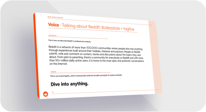 This is how we describe Reddit in professional contexts. Reddit is a network of more than 1 00 , 000 communities where people dive into anything through experiences built around their hobbies, interests and passions. People on Reddit submit, vote and comment on content, stories and discussions about the topics they care about. From pets to parenting, there’s a community for everybody on Reddit and with more than 5 0 + million daily active users, it is home to the most open and authentic conversations on the internet. This is our brand tagline, which communicates both the breadth and depth of content on Reddit. Dive into anything. Voice · Talking about Reddit: Boilerplate + tagline 34 BOILERPLATE/ TAGLINE/ REDDIT BRAND GUIDELINES