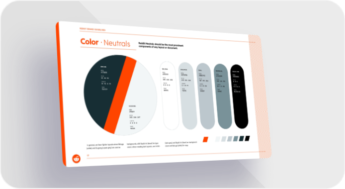 In general, we favor lighter layouts where Beluga (white) and Dugong (a pale grey) are used as backgrounds, with Squid Ink (black) for type colors. When creating dark layouts, use Urchin (dark grey) and Squid Ink (black) as background colors and Beluga (white) for copy. Reddit Neutrals should be the most prominent components of any layout or document. Color · Neutrals 17 BELUGA HEX #FFFFFF RGB 255 · 255 · 255 CMYK 0 · 0 · 0 · 0 PMS WHITE DOLPHIN HEX #D7DFE2 RGB 215 · 223 · 226 CMYK 5 · 1 · 0 · 11 PMS 7541C SEAL HEX #BBC7CC RGB 187 · 199 · 204 CMYK 8 · 2 · 0 · 20 PMS 428CP NARWHAL HEX #7A9299 RGB 122 · 146 · 153 CMYK 20 · 5 · 0 · 40 PMS 3526C SQUID INK HEX #000000 RGB 0 · 0 · 0 CMYK 0 · 0 · 0 · 0 PMS BLACK 6C DUGONG HEX #F26F7 RGB 242 · 246 · 247 CMYK 2 · 0 · 0 · 3 PMS 9062C URCHIN HEX #172E35 RGB 23 · 46 · 53 CMYK 57 · 13 · 0 · 79 PMS 7547CP REDDIT BRAND GUIDELINES