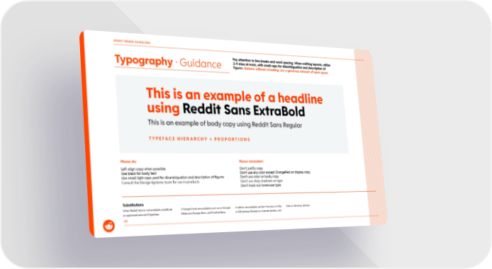Left align copy when possible Use black for body text Use small light caps used for disambiguation and description of figures Consult the Design Systems team for use in products Please do: Typography · Guidance Pay attention to line breaks and word spacing. When crafting layouts, utilize 3-4 sizes at most, with small caps for disambiguation and description of figures. Balance without crowding: use a generous amount of open space. 30 Please remember: Don’t justify copy Don’t use any color except OrangeRed on display copy Don’t use color on body copy Don’t use drop shadows on type Don’t track out lowercase type When Reddit Sans is not available, substitute an approved sans-serif typeface. If Google Fonts are available, such as on Google Slides and Google Docs, use Proxima Nova. If neither are available use San Francisco on Mac or iOS devices, Roboto on Android devices, and Arial on Windows devices. Substitutions REDDIT BRAND GUIDELINES