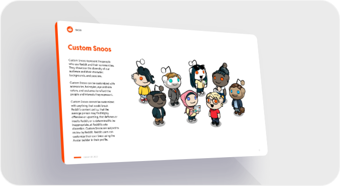 SNOO Custom Snoos represent the people who use Reddit and their communities. They showcase the diversity of our audience and their character, backgrounds, and passions. Custom Snoos can be customized with accessories, hairstyles, eye and skin colors, and costumes to reflect the people and interests they represent. Custom Snoos cannot be customized with anything that would break Reddit’s content policy, that the average person may find highly offensive or upsetting, that defames or insults Reddit, or is determined to be inappropriate, at Reddit’s sole discretion. Custom Snoos are subject to review by Reddit. Reddit users can customize their own Snoo using the Avatar builder in their profile. Custom Snoos 12 Version 09-2020