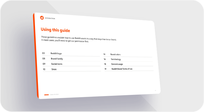 INTRODUCTION These guidelines explain how to use Reddit assets in a way that stays true to our brand. In most cases, you’ll need to get our permission first. 03 Using this guide 08 Brand family 09 Social icons 10 Version 09-2020 02 Reddit logo Snoo 14 Brand colors 19 Reddit Brand Terms of Use 16 Terminology 18 General usage