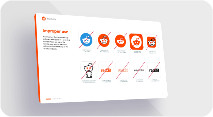 DON’T RECOLOR THE LOGO DON’T USE CLASSIC SNOO IN PLACE OF THE LOGO DON’T DISTORT THE SNOO HEAD DON’T OUTLINE THE SNOO HEAD DON’T REVERSE OUT THE LOGO DON’T REDRAW THE SNOO HEAD Improper use It is important that the Reddit logo and wordmark appear in a consistent manner. Please use one of the variations we provide, and never redraw the Snoo head logo or the Reddit wordmark. DON’T USE ANOTHER TYPEFACE DON’T RECOLOR THE WORDMARK DON’T DISTORT THE WORDMARK DON’T OUTLINE THE WORDMARK REDDIT LOGO Version 09-2020 07
