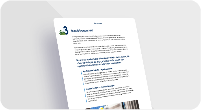 Our Approach Tools & Engagement 3 Enabling our suppliers’ success starts with using our customer voice to let our suppliers know that sustainability is essential to doing business with Salesforce. When our suppliers can say, “our customers are demanding climate action,” it can be easier for them to get internal buy-in to set SBTs and other ambitious climate goals. However, having the motivation to act is very different from knowing what to do. So at Salesforce we know we need to go further to ensure that our suppliers are successful in both setting SBTs and in achieving them. We can provide our suppliers with practical tools and resources that will help them reach critical milestones such as baselining their GHG emissions and understanding their own supply chain emissions. Since every supplier is at a different point in their climate journey, this is how we strategize our engagements to make sure we meet suppliers with the right solutions for where they are today: High Reduction Potential = High Engagement. We identify suppliers with the biggest potential emissions reduction impact and prioritize “hands-on” engagements with them. To do this, we estimate our value chain emissions from each supplier using spend and economic-based emissions factors and then map potential impact based on public information like corporate sustainability reports and participation in climate initiatives, as well as business factors like industry and size. Scalable Solutions for Common Challenges. We get to know our suppliers to develop “one-to-many” approaches that solve common challenges. For example, in 2020 we surveyed our strategic suppliers to gather direct input on their progress and understand their most significant sustainability challenges. We also integrate what we learn during one-on-one supplier conversations and during touchpoints such as business reviews. 6 | Salesforce.com/sustainability