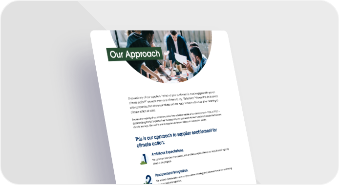 Our Approach If you ask any of our suppliers, “which of your customers is most engaged with you on climate action?” we want every one of them to say, “Salesforce.” We want to do business with companies that share our values and are ready to work with us to drive meaningful climate action at scale. Because the majority of our emissions come from activities outside of our direct control – 76% in FY211 – decarbonizing the full impacts of our business requires us to work with our suppliers to accelerate their own climate journeys. We need to enable suppliers to take ambitious climate action quickly. This is our approach to supplier enablement for climate action: Ambitious Expectations. We communicate clear, transparent, and ambitious expectations to our suppliers and regularly 1 check in on progress. Procurement Integration. We embed climate action into our procurement strategy and processes to use our purchasing 2 power to motivate suppliers. Tools and Engagement. We implement scalable, adaptable engagement strategies and provide tools that accelerate 3 suppliers’ decarbonization efforts, wherever they may be on their own sustainability journey. 1 Measured using the location-based methodology. Using the market-based methodology, our Scope 3 emissions account for 92% of total emissions FY21 Stakeholder Impact Report ( ). 3 | Salesforce.com/sustainability