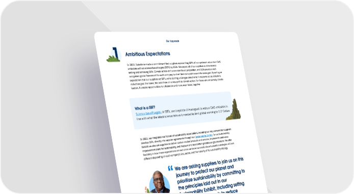 Our Approach Ambitious Expectations 1 In 2019, Salesforce made a commitment that suppliers representing 60% of our upstream value chain GHG emissions will set science-based targets (SBTs) by 2024. We expect all of our suppliers to strive toward setting and achieving SBTs. Climate action isn’t a one-size-fits-all proposition, and SBTs provide a well- recognized global framework for each company to chart their own path toward the same goal. By setting an expectation that our suppliers set SBTs, we’re starting a dialogue about what it means to set an emissions reduction goal. For some, this sets them on a new path to climate action. For those who are already climate leaders, it creates opportunities to collaborate and move even faster, together. What is a SBT? Science-based targets, or SBTs, are corporate climate goals to reduce GHG emissions in line with what the latest science tells us is needed to limit global warming to 1.5° Celsius. In 2021, we integrated our full set of sustainability expectations, including our requirement that suppliers develop SBTs, directly into supplier agreements through our Sustainability Exhibit. In our Sustainability Exhibit we also ask suppliers to deliver carbon neutral products and services, implement continuous improvement plans for sustainability, and measure and report their greenhouse gas emissions. We offer flexibility in how these expectations are met since we know successful decarbonization strategies will look different depending on each company’s size, sector, and the maturity of its sustainability strategy. We are asking suppliers to join us on this journey to protect our planet and prioritize sustainability by committing to the principles laid out in our Sustainability Exhibit, including setting science-based targets to reduce greenhouse gas emissions. Craig Cuffie, EVP & Chief Procurement Officer, Salesforce In order to provide clear information about our expectations, we’ve made our Sustainability for Salesforce Suppliers guide publicly available on Trailhead, Salesforce’s free online learning platform. Any company interested in doing business with us can access a comprehensive overview of our expectations and a better understanding of the Exhibit, as well as a detailed explanation of how we embed sustainability throughout our procurement processes. 4 | Salesforce.com/sustainability
