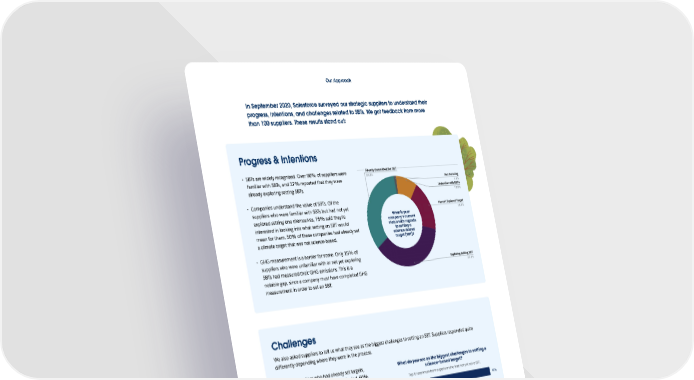 Our Approach In September 2020, Salesforce surveyed our strategic suppliers to understand their progress, intentions, and challenges related to SBTs. We got feedback from more than 100 suppliers. These results stand out: Progress & Intentions M SBTs are widely recognized. Over 90% of suppliers were familiar with SBTs, and 37% reported that they were already exploring setting SBTs1 M Companies understand the value of SBTs. Of the suppliers who were familiar with SBTs but had not yet explored setting one themselves, 75% said they’re interested in looking into what setting an SBT would mean for them. 50% of these companies had already set a climate target that was not science-based1 M GHG measurement is a barrier for some. Only 15% of suppliers who were unfamiliar with or not yet exploring SBTs had measured their GHG emissions. This is a notable gap, since a company must have completed GHG measurement in order to set an SBT. Challenges We also asked suppliers to tell us what they see as the biggest challenges to setting an SBT. Suppliers responded quite differently depending where they were in the process. M Among suppliers who had already set targets, supply chain emissions were top of mind. 60% considered “insufficient understanding of or control over their supply chain to tackle Scope 3 emissions” to be the biggest barrier to target setting. Only 30% of suppliers who had yet to set an SBT named this as one of their biggest challenges.‰ M For the group without a target a “lack of internal resources to effectively manage and drive the process for setting an SBT" was the leading challenge, cited by 41% of suppliers. Additionally, 30% cited a “lack of technology and tools to help them manage data to set and/or achieve a target.” 7 | Salesforce.com/sustainability