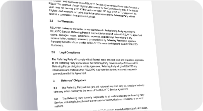 TheReferring Party may use marketing materials created or approved by RELAYTO. Any marketing materials not provided by RELAYTO must be approved in advance by RELAYTO in writing. Any other use of RELAYTO is unauthorized without prior written permission. 2.4 ConfirmedSale TheEligible Lead must enter into a RELAYTO Service Agreement and Order within 240 days of RELAYTO’sapproval of such Eligible Lead in order for the Commission to apply. If the Eligible LeaddoesnotbecomeaRELAYTOCustomerwithin240daysofRELAYTO’sapproval,the Eligible Lead reverts to not being eligible for commission and the Referring Party will not receive a commission from any eventual sale. 2.5 NoWarranties RELAYTOmakesnowarrantiesorrepresentations to the Referring Party regarding the RELAYTOService.Referring Party is responsible for (and will indemnify RELAYTO against) all claims, damages, losses, settlements, expenses, and attorneys’ fees relating to any representation, warranty, statement, or commitment by Referring Party (or its agents or Partners) that differs from or adds to RELAYTO’s warranty obligations made to RELAYTO Customers. 2.6 Legal Compliance TheReferring Party will comply with all federal, state, and local laws and regulations applicable to the Referring Party’s provision of the Referring Party Services and performance of the Referring Party’s obligations in this Agreement. Referring Party will give RELAYTO any information and materials that RELAYTO may from time to time, reasonably request in connection with this Agreement. 3. Referrors’ Obligations 3.1 TheReferring Party will not (and will not permit any third party to), directly or indirectly take any action contrary to the terms of the RELAYTO Service Agreement. 3.2 TheReferring Party is solely responsible for all matters related to the Referring Party Service, including but not limited to any customer communications, complaints, or warranty matters. 3.3 TheReferring Party and the RELAYTO Customer, are solely responsible for the design, content, imagery, and maintenance of RELAYTO Customer’s website in connection with using the RELAYTOService.